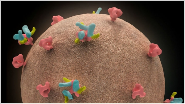 Antiretroviral drugs allow HIV-infected people to maintain low viral loads, but they must take the medication daily for the rest of their lives. A team of scientists led by Michel Nussenzweig of Rockefeller University in 2018 developed and tested a drug made of two antibodies, which was able to suppress the spread of the immunodeficiency virus for several months in two patients. If the results obtained by Nussenzweig's group can be repeated in larger studies, the "cocktail" of the two antibodies could change the lives of HIV-infected people, reduce the risk of the virus developing resistance to antiretroviral drugs and even slow the spread of HIV infection worldwide. In the images, antibodies (blue and green) attach to the immunodeficiency virus, binding to (pink) proteins of its protein coat.