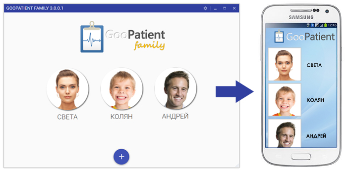 И мобильная и десктоп-версия используют одну и ту же базу данных (.sqlite), поэтому, чтобы синхронизировать их, нужно скопировать этот файл базы данных с компьютера на смартфон или обратно. На смартфоне база находится в папке / Android / data / com.NGSE.goopatient / files /, а на компьютере - в папке, заданной в Настройках.